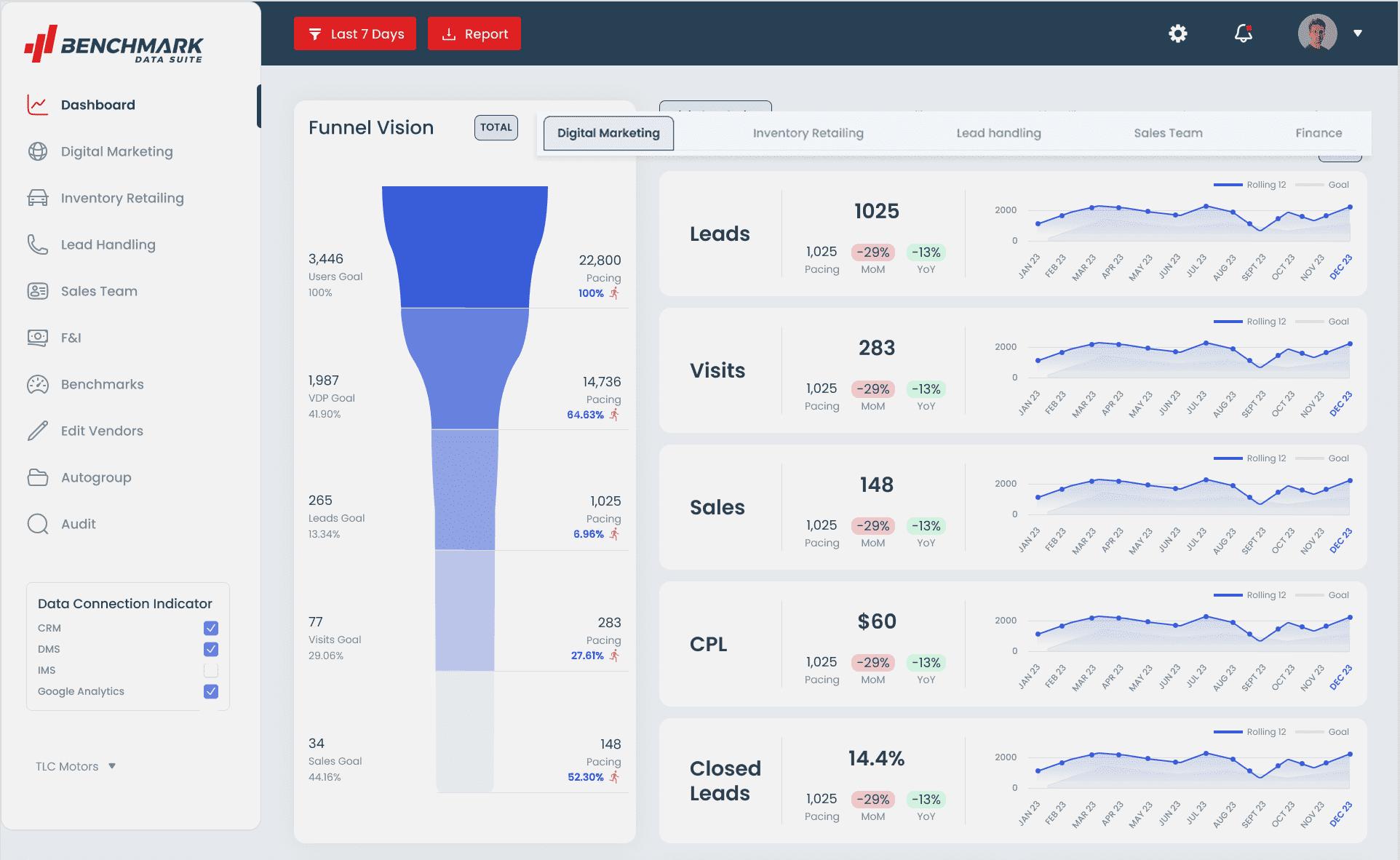 Benchmark provides real-time data analysis and reporting on key performance indicators (KPIs) across various areas, including digital marketing, inventory, lead handling, sales, and finance. These insights help dealerships identify areas for improvement, optimize operations, and drive growth and profitability.