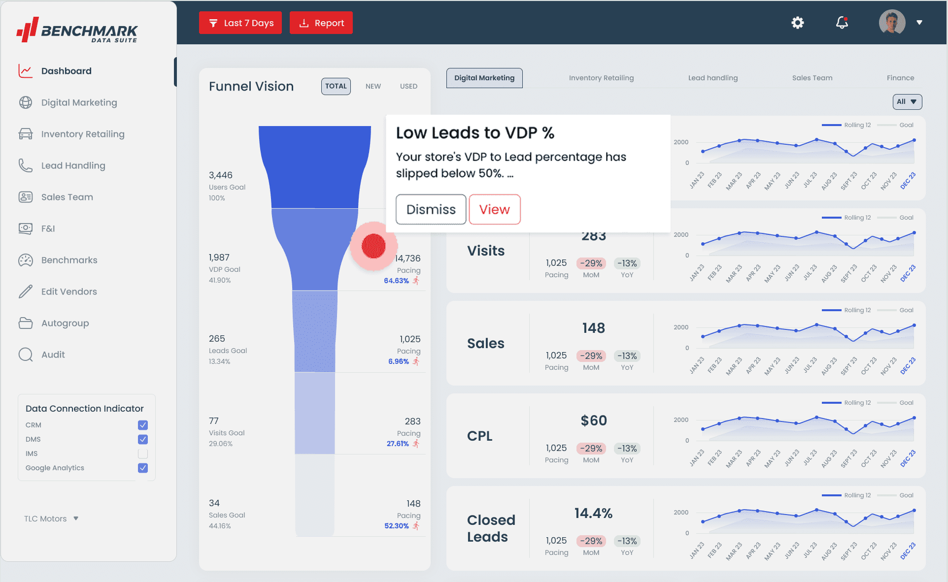 Cut through the noise with Benchmark. We bring together data from your digital marketing efforts, inventory movements, and lead interactions, providing you with a solid foundation for smart, strategic choices that drive your dealership’s growth.